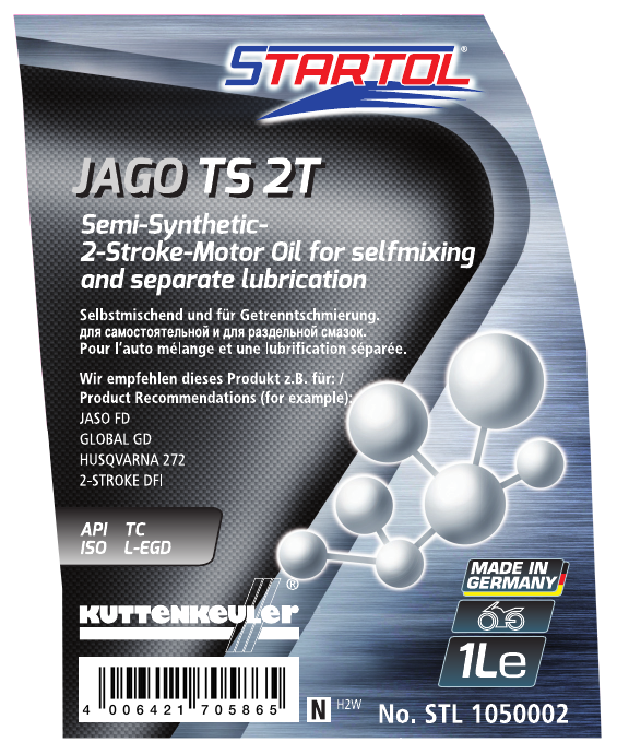 JAGO TS 2T is a modern two‑stroke engine oil with a synthetic base oil structure and extremely effective "low smoke" two‑stroke additives for universal use in mixture and fresh oil lubricated air and water cooled petrol two‑stroke engines. JAGO TS 2T Due to its additives, it is ideally suited for use in modern high‑performance two‑stroke engines of motor vehicles, motorcycles, mopeds, lawn mowers, saw chain drives, snowmobiles, etc.