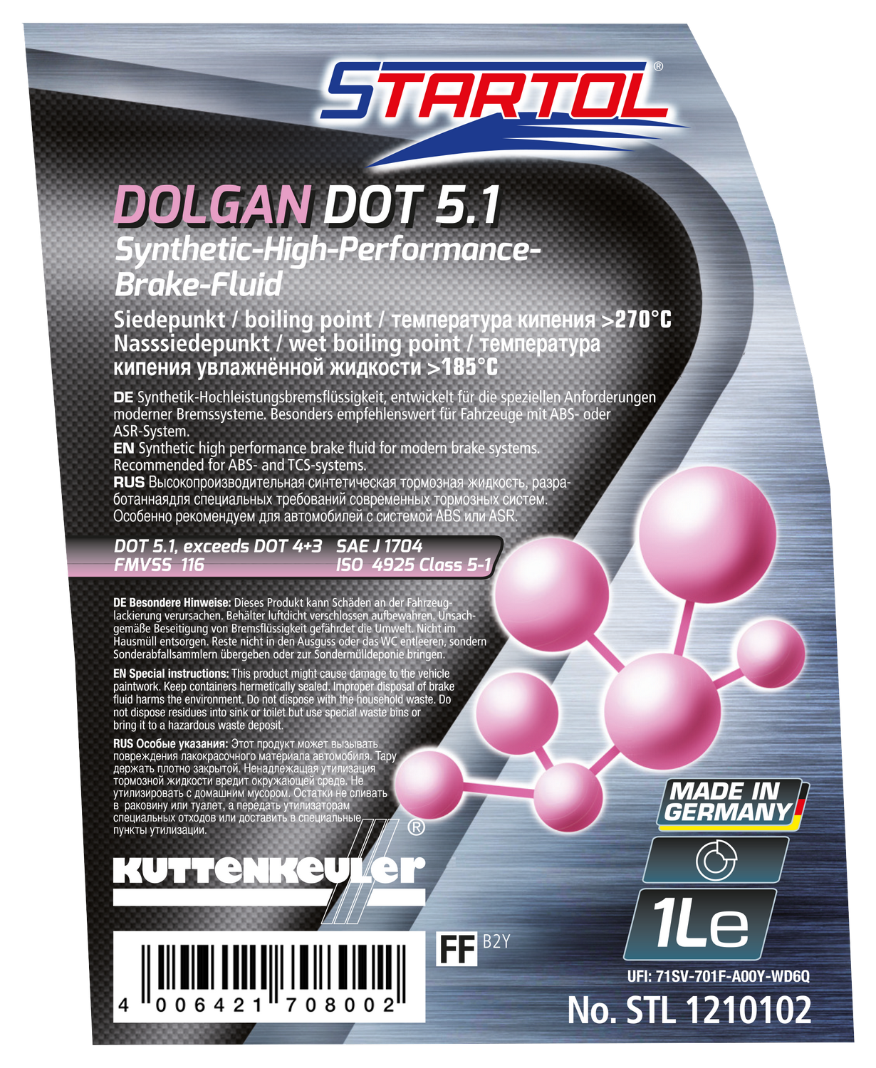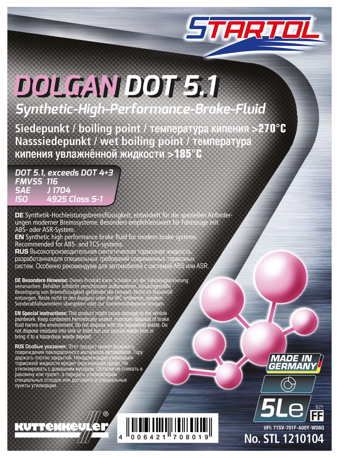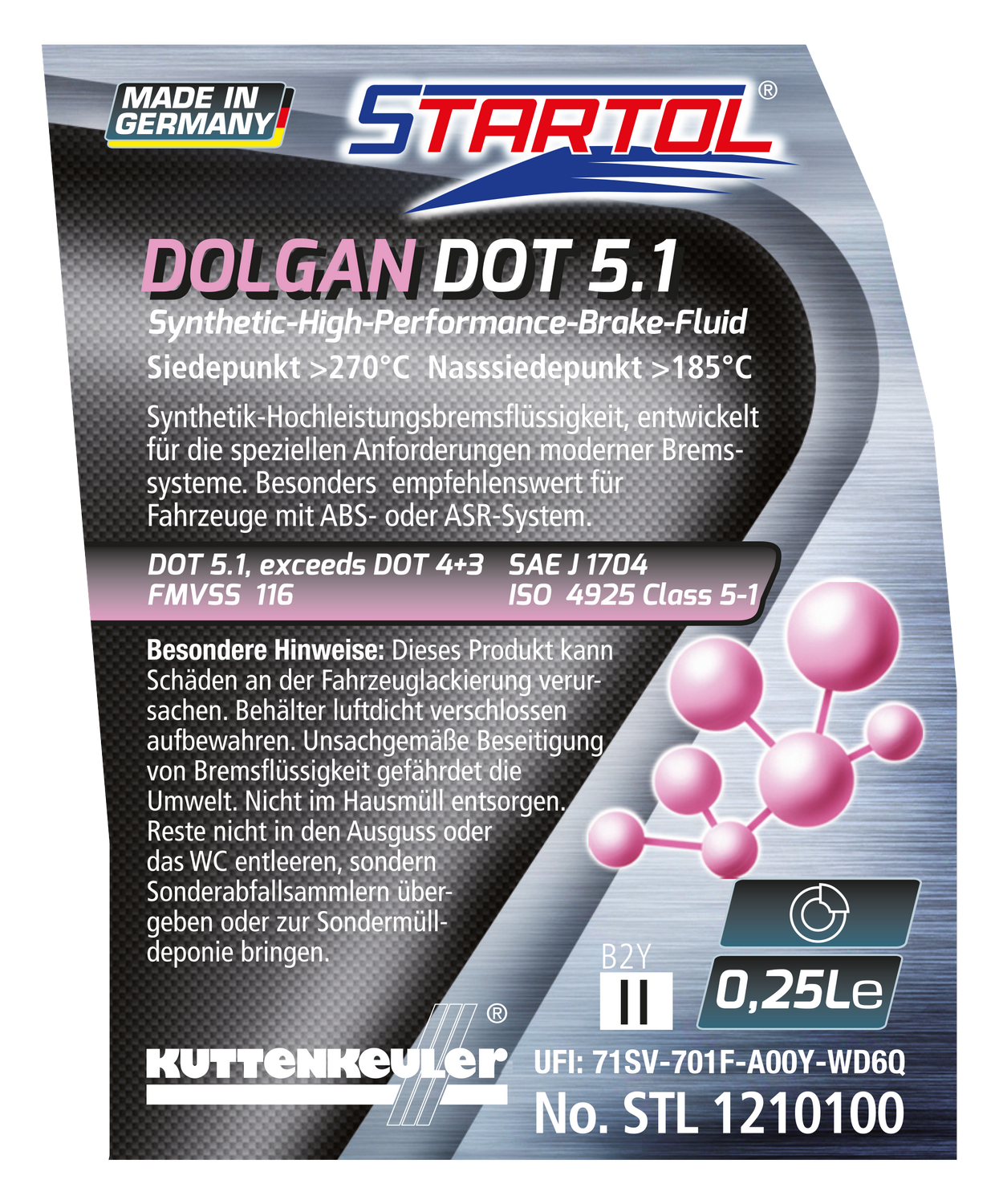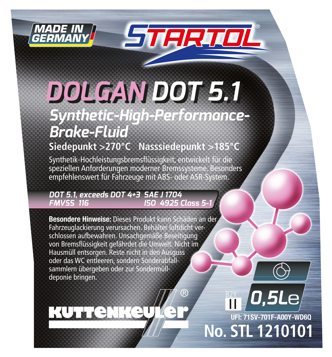 DOLGAN DOT 5.1 ist eine synthetische Hochleistungsbremsflüssigkeit, die speziell für die Anforderungen moderner Kfz‑Bremssysteme konzipiert ist.