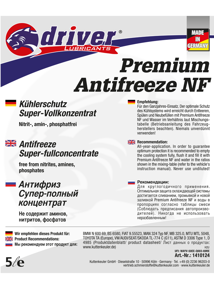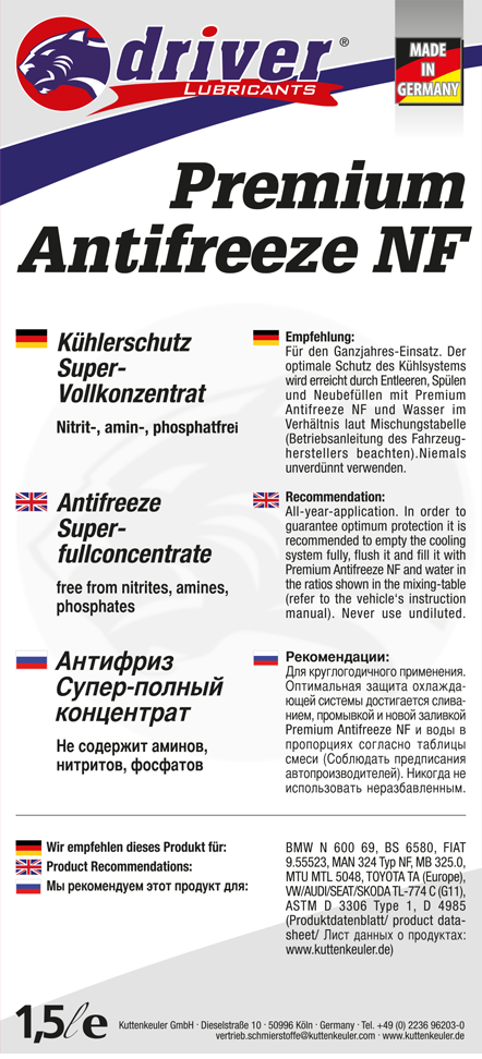 Due to the specially used additives, Antifreeze ANF 2270 is ideal for aluminium, light metal and grey cast iron engines (please note the manufacturer's instructions).