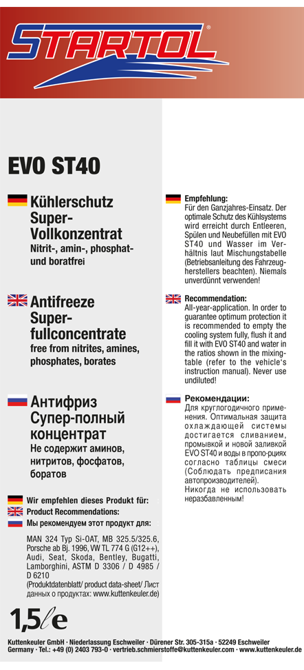 EVO ST40 is a full concentrate radiator protection and heat transfer agent based on ethylene glycol for summer and winter operation, which enables maintenance‑free protection against frost, overheating and rust formation (long‑life radiator protection). EVO ST40 is a new radiator protection and heat transfer agent with high‑quality corrosion additives for the engine and cooling system and meets the current requirements of many OEMs. EVO ST40 contains an inhibitor package based on silicate and salts of organic acids (Si‑OAT coolant). EVO ST40 is free of nitrite, amine, phosphate and borate.