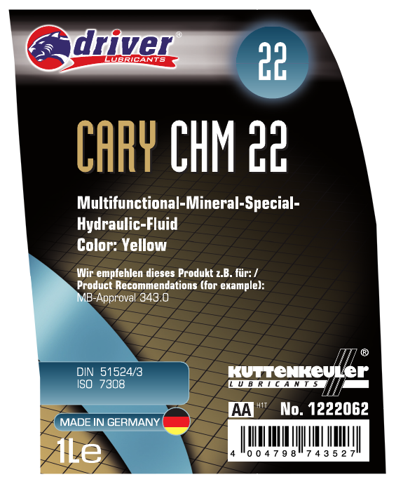 CARY CHM 22 ist eine Spezialhydraulikflüssigkeit auf Mineralölbasis für den Einsatz in speziell gekennzeichneten Flüssigkeitsbehältern, für die hydraulische Unterstützung von Niveauregulierung, Lenk‑ und Bremshilfen. CARY CHM 22 wurde entwickelt zum Gebrauch in Fahrzeughydrauliken in einem Temperaturbereich zwischen ‑40°C und 100°C.